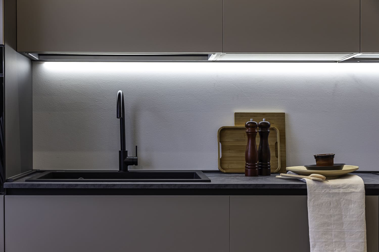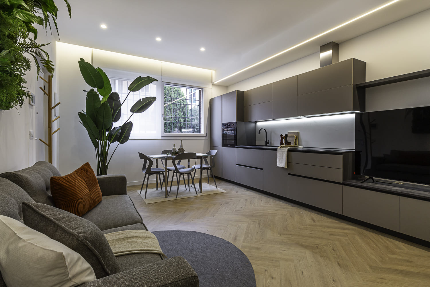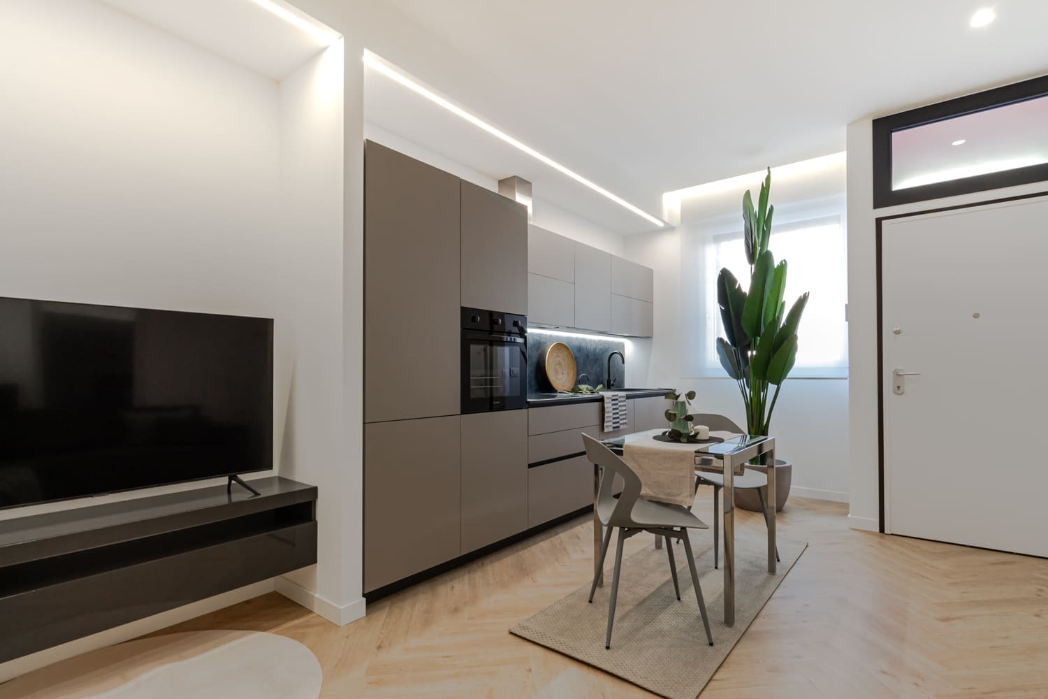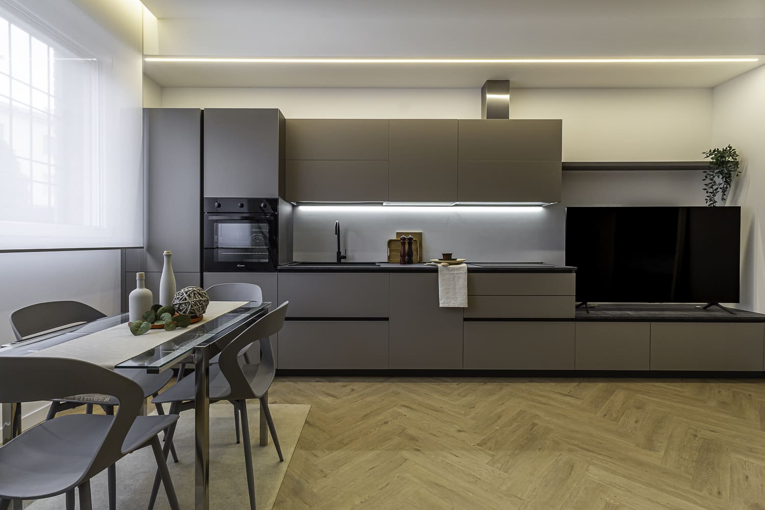 Dal divano grigio con cuscino terracotta lo sguardo corre alla pianta di banano che filtra la luce della finestra; la cucina lineare, lunga tutta la parete, integra TV e pensile a nastro: una sola linea continua enfatizzata dal taglio LED a soffitto. -