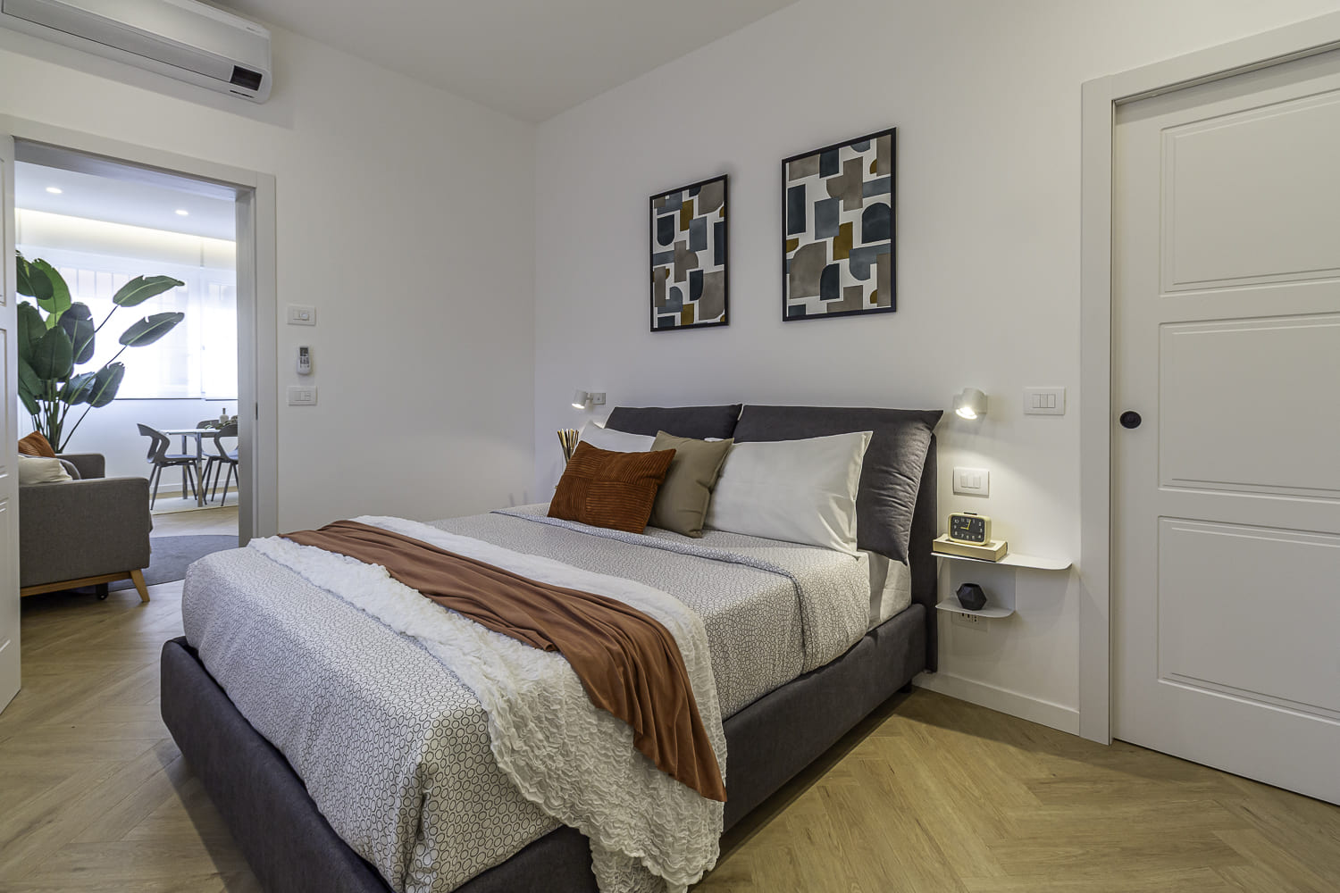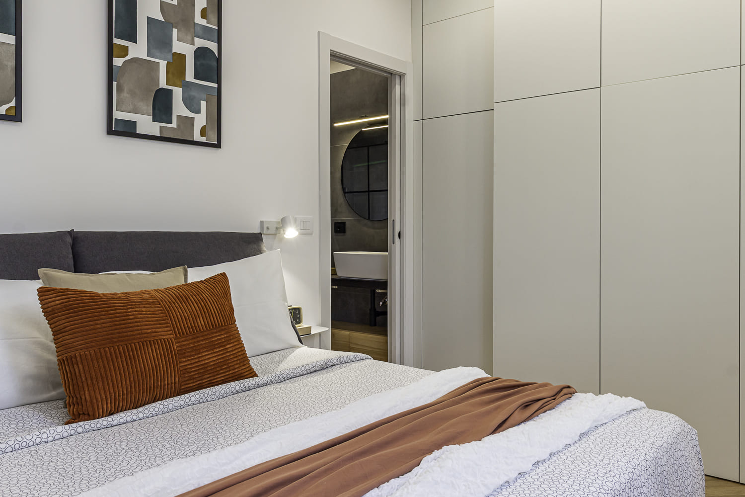 Biancheria neutra, plaid terracotta e quadri geometrici coordinati. Una intera parete armadi a filo garantisce ordine invisibile. -