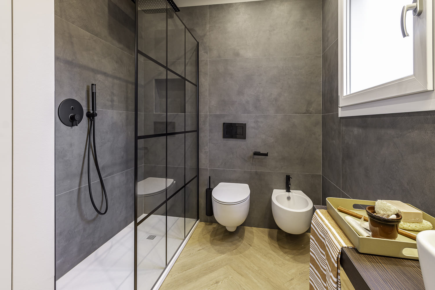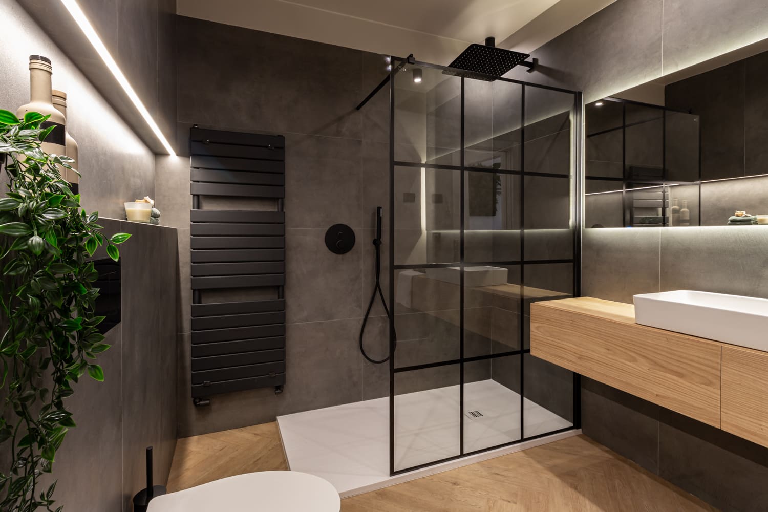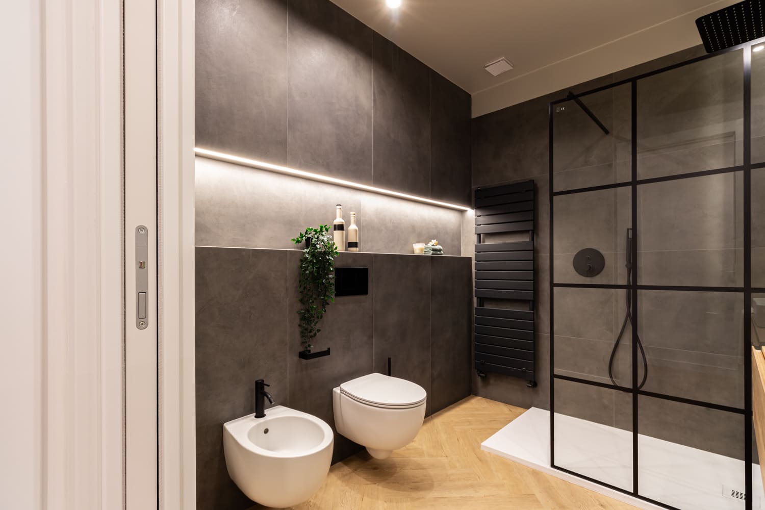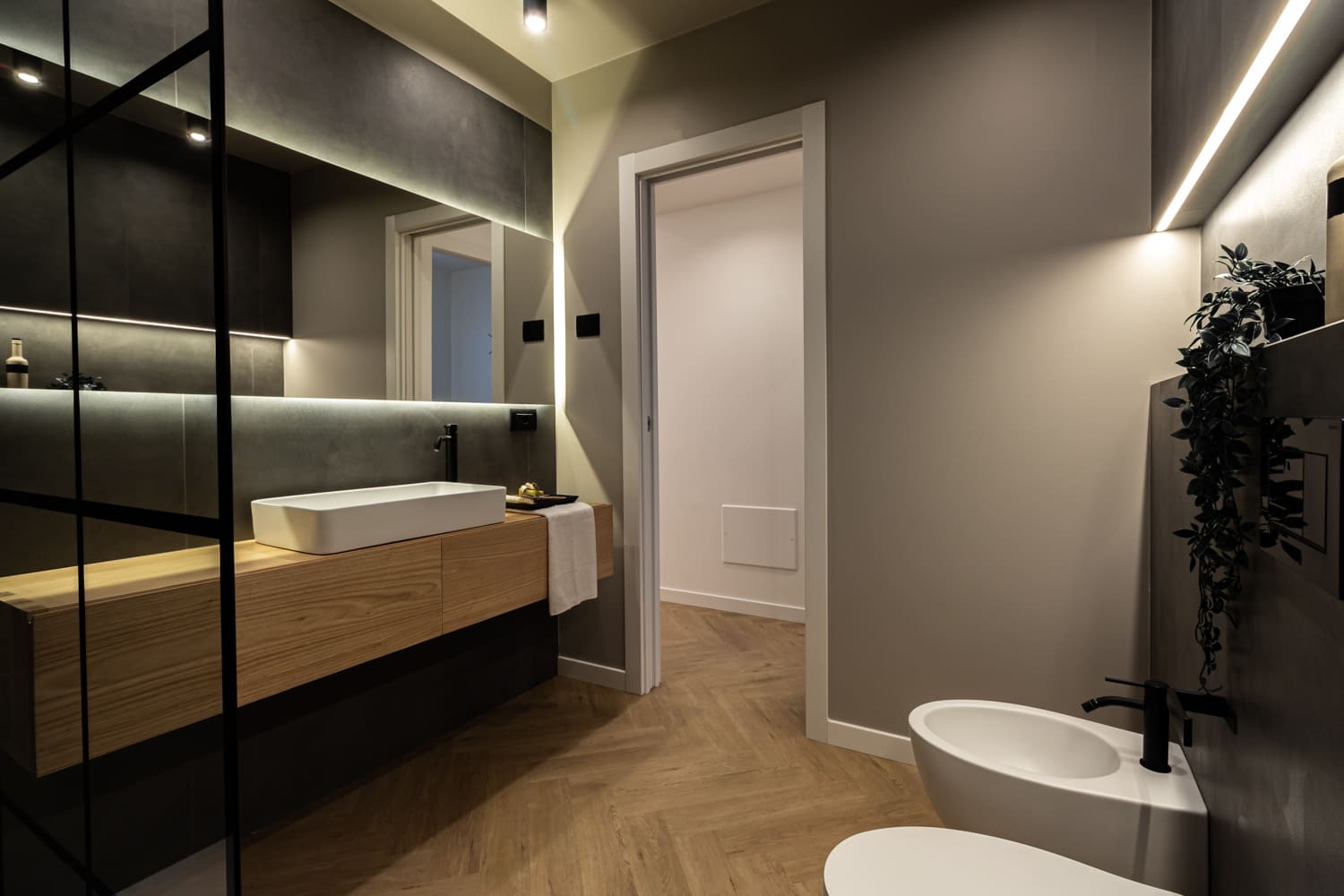 - Bagno – grès antracite, vanity in legno sospeso, specchio a tutta lunghezza con strip LED e rubinetteria nera satinata; doccia walk-in incorniciata da profili industrial neri.