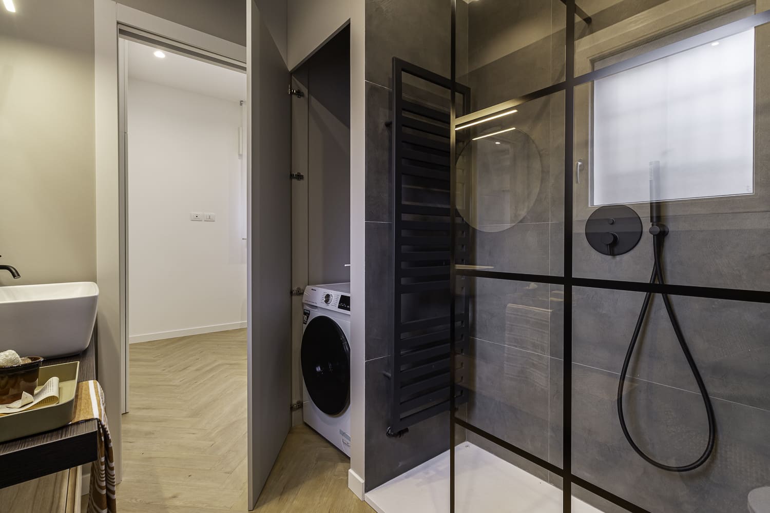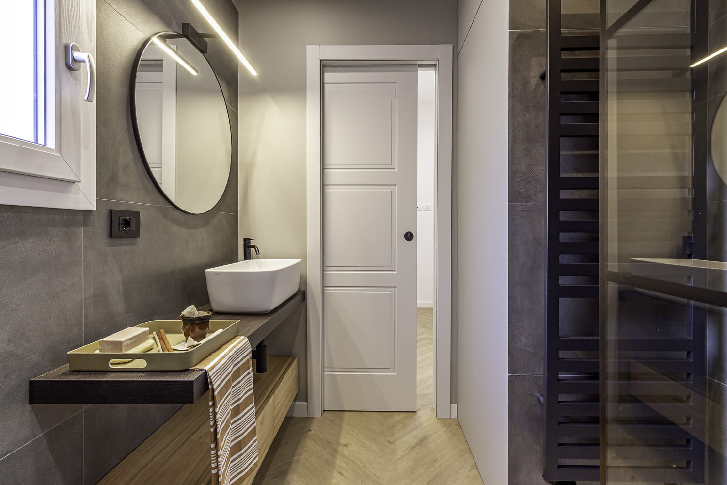 Lastre grigie effetto pietra, specchio tondo in legno scuro. La doccia walk-in è scandita da griglia nera; dietro la porta a tutta altezza una lavanderia incassata (lavatrice nascosta) conferma l’approccio di linearità lungo le pareti.