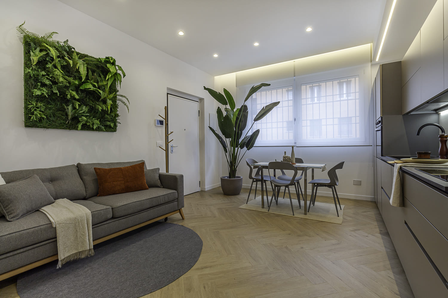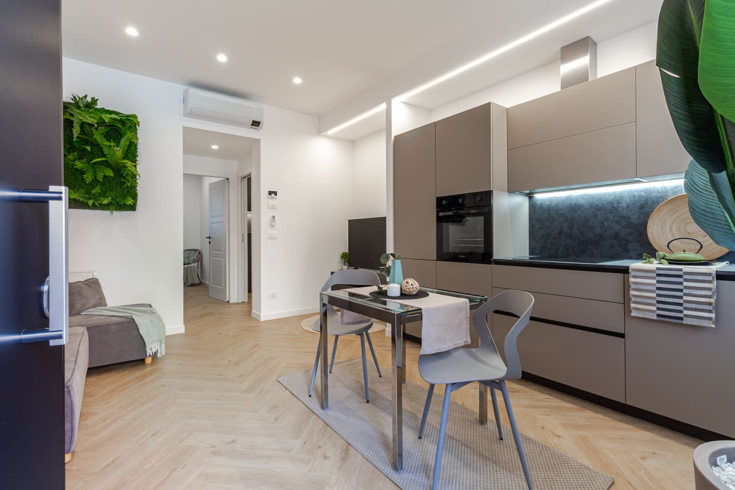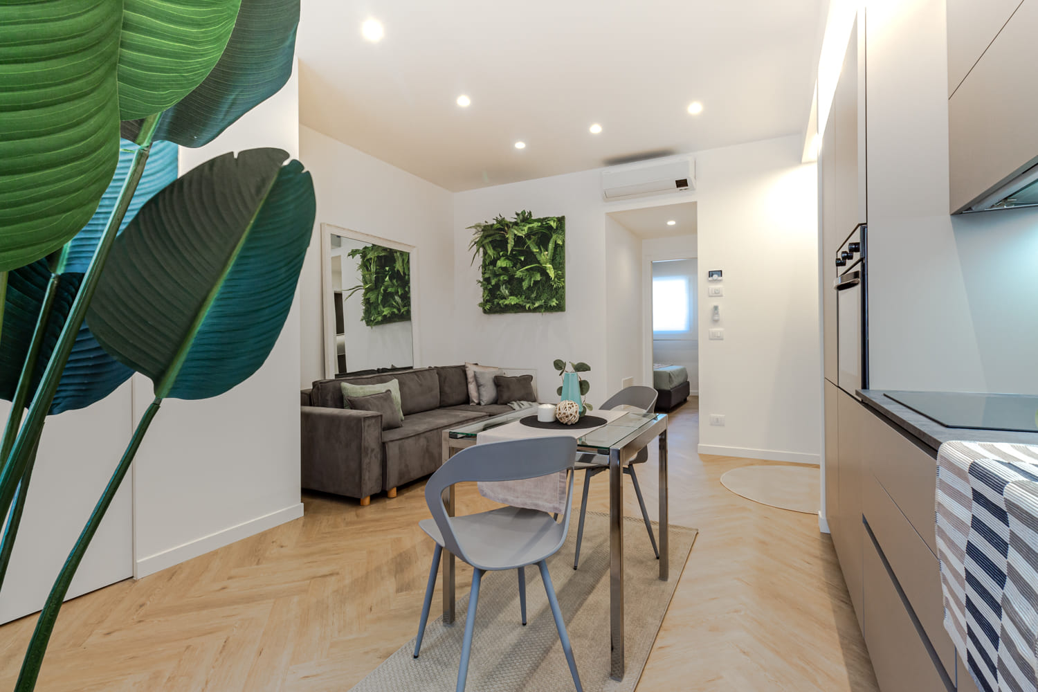 Entrando, lo sguardo viene catturato dal quadro vegetale sospeso sopra il divano e dal banano in vaso che divide idealmente living e dining. La cucina a tutta parete integra strip LED a luce fredda, bilanciata dal calore del parquet e da piccoli oggetti in ceramica verde salvia.