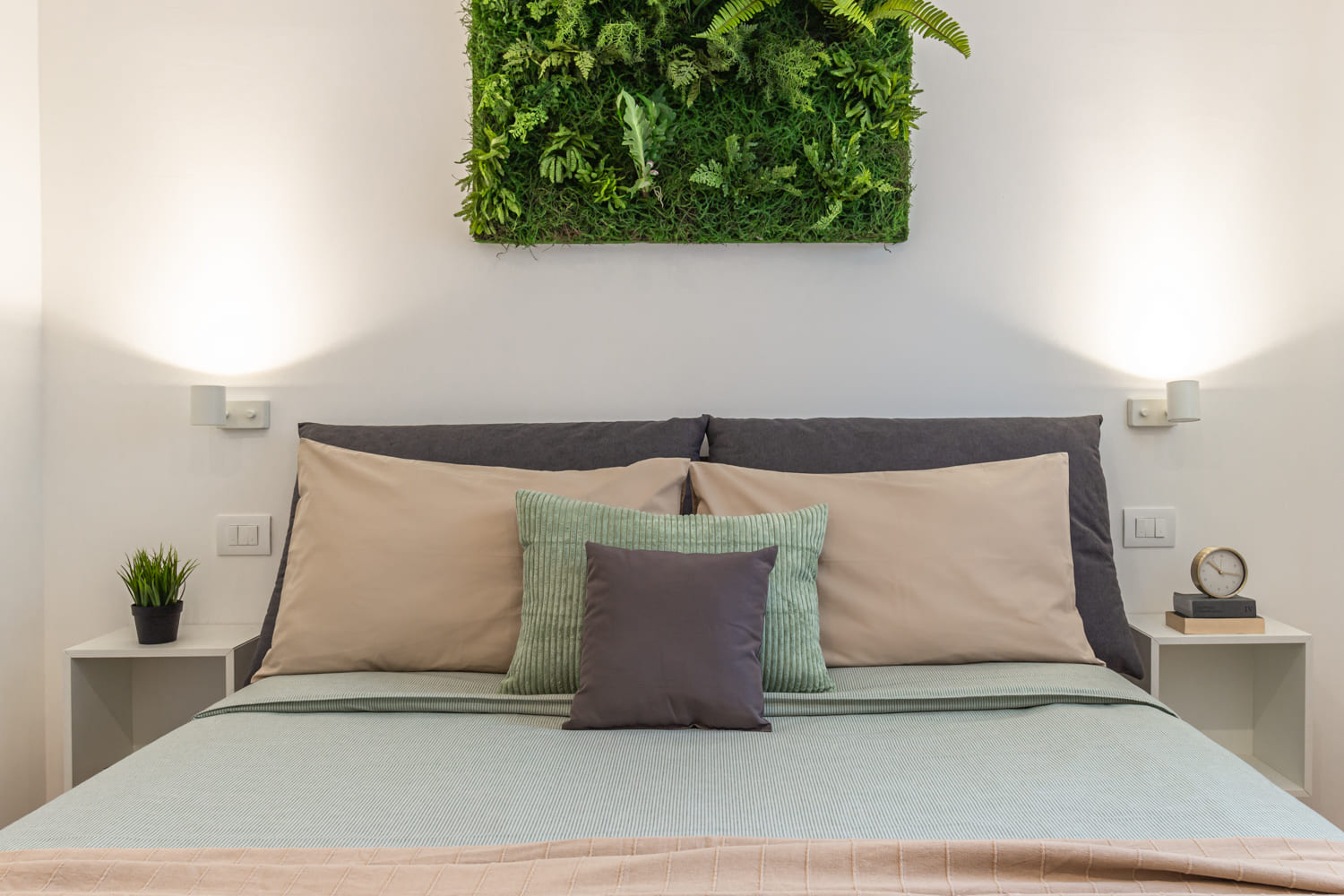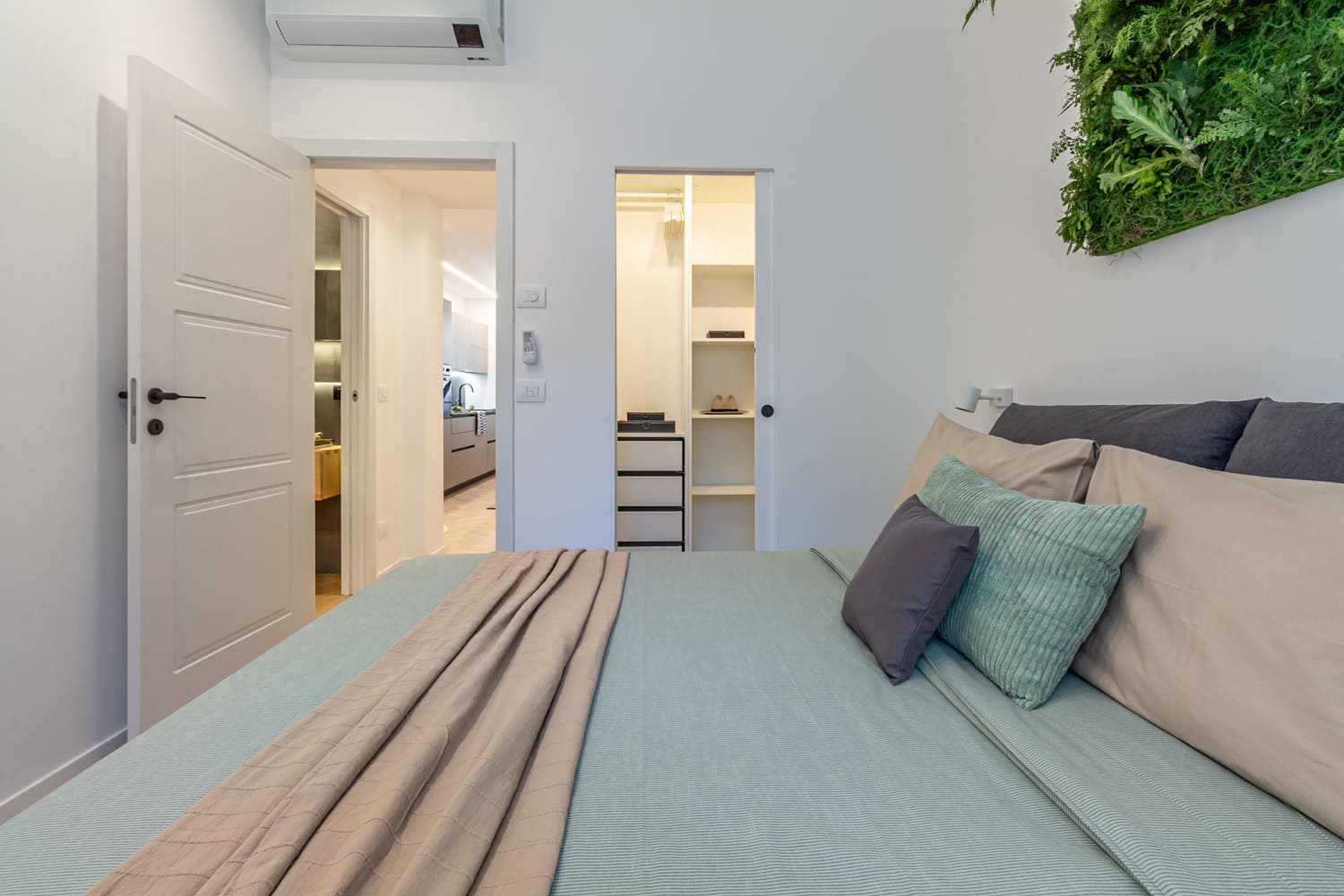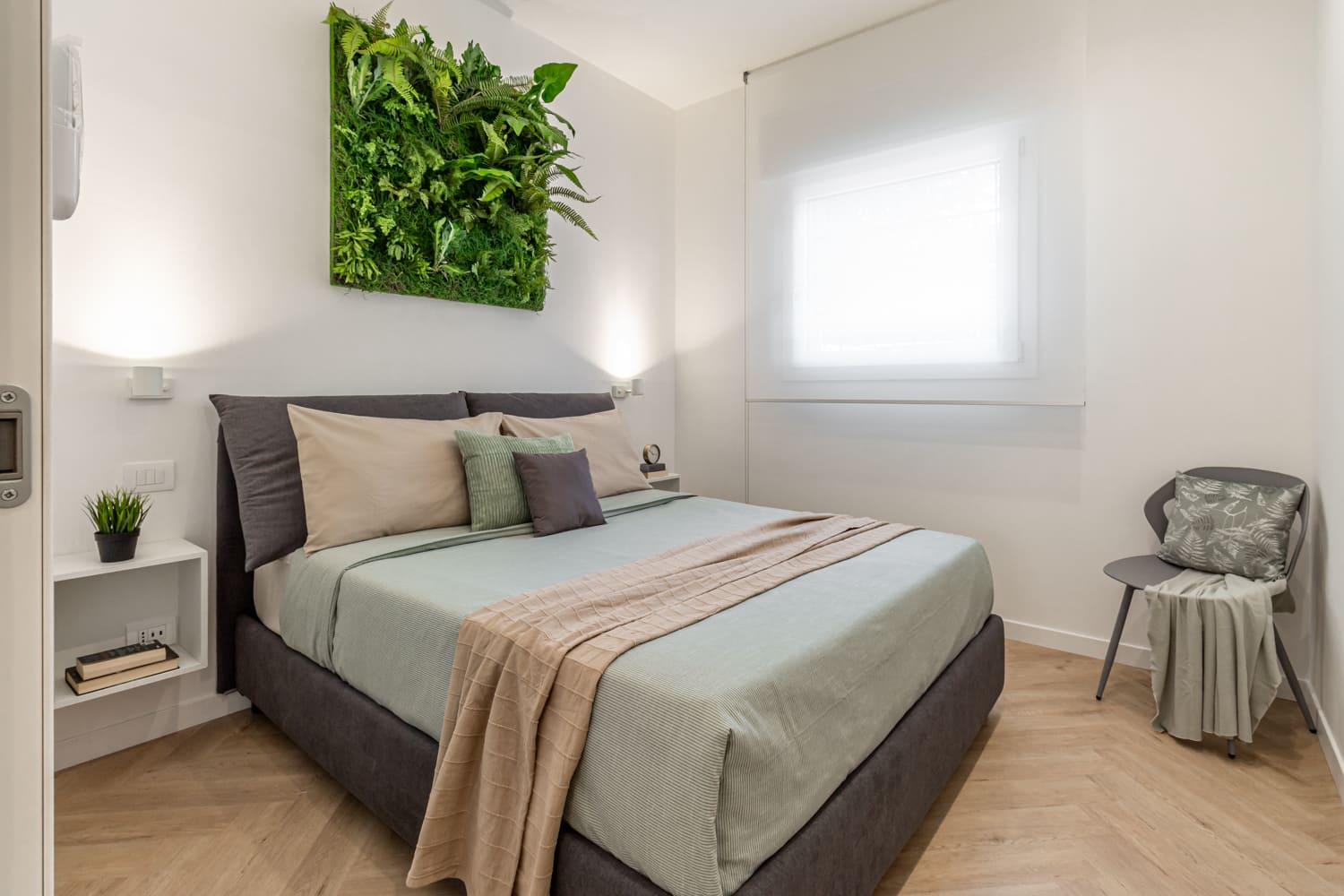 - Camera – tono su tono verde/grigio, tessuti naturali e quadro vegetale gemello; la cabina armadio retro-illuminata è accessibile dietro la testiera.